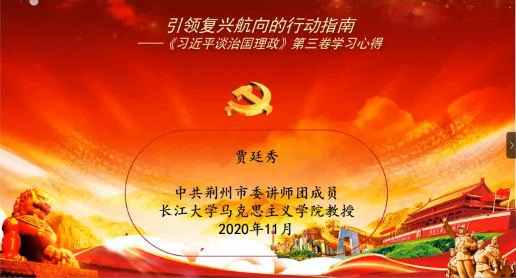 贾教授分别从世情、国情、党情三个角度深入剖析以习近平同志为核心的党中央治国理政思想背景,围绕第三卷的主线内容“中国在新时代中如何坚持和发展中国特色社会主义”向大家分享了自己的理解。第一,“不忘初心,牢记使命”是每个共产党员应铭记于心的行为准则。第二,增强忧患意识,防范化解风险挑战。第三,要继续完善和发展我国国家制度和治理体系。《习近平谈治国理政》第三卷的出版发行,生动记录了党的十九大以来以习近平同志为核心的党中央,着眼“两个大局”,统揽“四个伟大”,团结带领全党全军全国各族人民推动党和国家各项事业取得新的重大进展的伟大实践,集中展示了马克思主义中国化的最新成果。