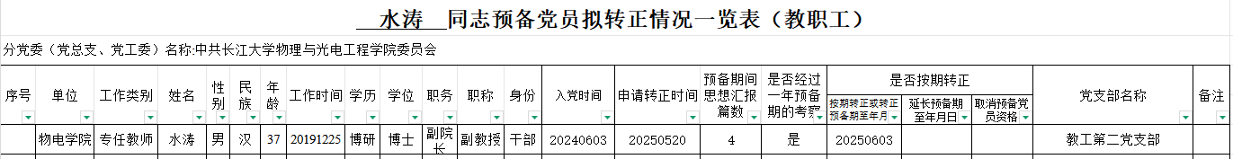 经过党支部对预备党员1年的培养教育和考察,经支部委员会研究确定,报分党委审查同意,将于近期召开党员大会讨论水涛同志预备党员转正,特在全院范围内进行公示。