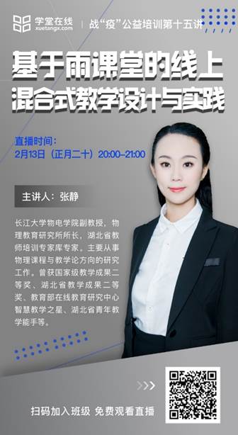 为进一步有效防控新型冠状病毒感染的肺炎疫情,落实教育部“停课不停学”的通知精神要求,清华学堂在线战“疫”公益培训邀请了beat365官网中文版本张静博士,于2月13日通过雨课堂直播的方式做了《基于雨课堂的线上混合式教学设计与实践》的报告。
