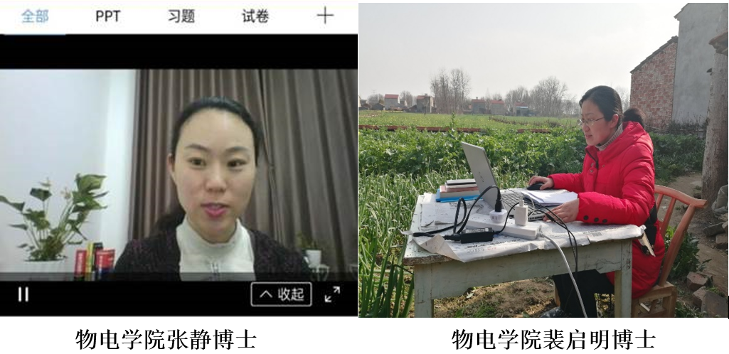 在既没有网络,也没有教学资料的情况下,被隔离在农村老家的裴启明老师积极投入到了紧张的教学工作中。因为地处偏远,4G信号差,裴老师将桌子搬到了老家的菜园较空旷的地方摸索网上教学平台“雨课堂”。本学期裴老师讲授大三年级员工的《热力学与统计物理》,大多员工正在进行考研准备。在课堂上裴老师加入一些数学知识的讲解,帮助同学们复习相关内容,并督促他们趁此机会,在家认真补上自己所欠缺的知识。战“疫”特殊时期,战“疫”和防控就是最大的思政,裴老师通过“雨课堂”积极融入战“疫”,让员工明白现在安心宅家学习,不给全社会防控抗疫增加负担,将来考上研究生学好本领,还能给社会做更多更大的贡献。裴老师还担任了物理学16级两个班的班主任。裴老师每天在班级群了解员工动态,并及时通过雨课堂和腾讯会议的方式给同学们开主题班会,让同学们认清当前的就业形势,明确当前的任务。班会上,通过给同学们布置 “国难当头,当代老员工应该有怎样的担当”的主题,让所有同学参与讨论。裴老师还通过线上问卷调查的方式,了解每一位同学当前的学习和就业困难。针对调查结果,裴老师电话落实每一位同学反馈的问题,力争做到一生一策,工作真正落实到位。
