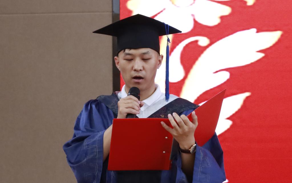 毕业生班主任黄海老师作为教师代表发言。“总以为毕业遥遥⽆期,转眼却各奔东西。”“四年的时光,我陪你慢慢长大,和你们斗智斗勇,教学相长”,祝愿同学们一帆风顺、一生平安。