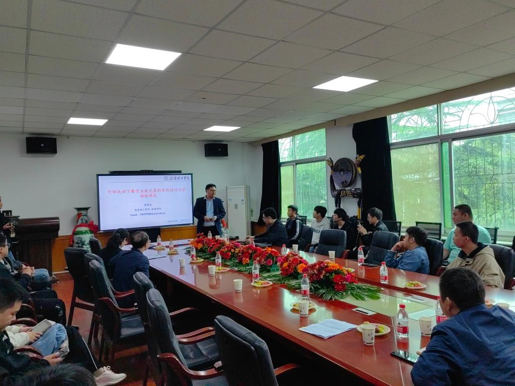 荆楚理工公司数理公司蒋再富副教授作了“外部扰动下半导体环形激光器非线性动力学研究”的报告,介绍了量子点激光器的研究现状及基本性能,外部扰动下量子点激光器展现的非线性动力学特性,展示了一种基于光注入量子点激光器呈现的单周期动力学获取光子微波信号的方案,探讨了微波频率、微波强度和微波线宽随注入参数的变化规律。