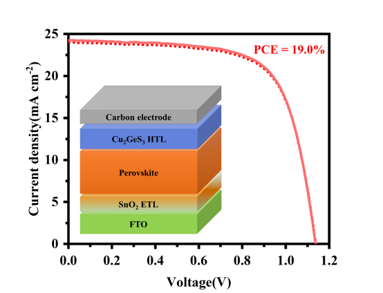 针对上述问题,杨文星教授团队设计并合成出了一种新型的无机半导体纳米晶空穴传输材料Cu2GeS3。通过一步加热方法(one-pot heating up method),可以合成得到颗粒尺寸均匀、结晶性良好、分散性优异的Cu2GeS3半导体纳米晶。该纳米晶能够在钙钛矿表面形成均匀、致密的无机空穴传输层。Cu2GeS3空穴传输层能够高效地提取钙钛矿吸光层中的光生空穴,并将它们输运到碳电极;同时,合适的能级结构能够显著抑制界面处载流子的复合。优化制备工艺后,基于Cu2GeS3半导体纳米晶空穴传输层的碳电极钙钛矿电池的最高光电转换效率可以达到19%,优于传统的CuPc、CuSCN、NiOx、CuInS2、Cu2ZnSnS4等无机空穴传输层材料;同时电池在90天内能够保持优异的稳定性。该项研究创新性地引入了无机Cu2GeS3纳米晶空穴传输层,优化了钙钛矿/ Cu2GeS3/碳电极界面处的能级结构,为进一步提升碳电极钙钛矿电池的性能提供了一种可行的方案;同时,Cu2GeS3纳米晶空穴传输层使用溶液法加工制备,兼容大面积钙钛矿电池的制备工艺,具有巨大的商业化应用潜力。