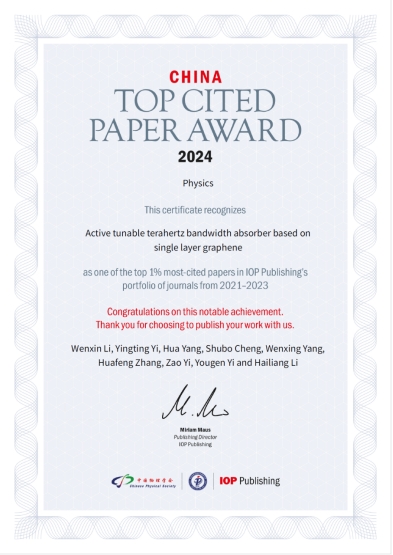 近日,英国皇家物理学会出版社(IOP Publishing)公布了“2023 CHINA TOP CITED PAPER AWARD”的获奖名单,表彰了2021至2023年间旗下期刊中前1%高被引论文。beat365官网中文版本2022级研究生李文鑫作为第一作者的研究成果成功入选,论文题为 “Active tunable terahertz bandwidth absorber based on single layer graphene”。该论文发表在期刊《理论物理通讯》(Communications in Theoretical Physics) 上,通讯作者为公司程书博副教授和杨文星教授、以及西南科技大学易早教授。