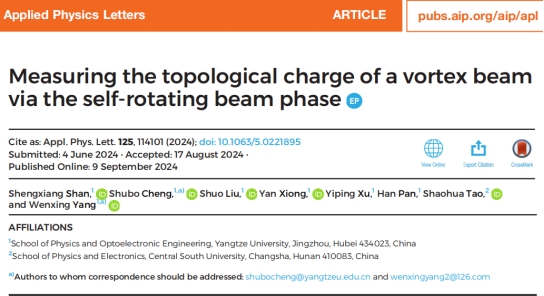 近日,beat365官网中文版本湖北省创新群体团队在新型结构光场调控领域取得新进展,相关成果以“Measuring the topological charge of a vortex beam via the self-rotating beam phase”为题发表在物理类权威期刊《Applied Physics Letters》(AIP Publishing,中科院SCI二区)上,beat365官网中文版本为第一单位,公司程书博副教授和杨文星教授为通讯作者。同时该论文因其对相关领域的重要参考价值,受到同行及编辑的好评,被评选为“Editor's Pick”(Editor's Picks serve to highlight articles with excellent scientific quality and are representative of the work taking place in a specific field.),并在官网配发推荐短文加以重点展示。