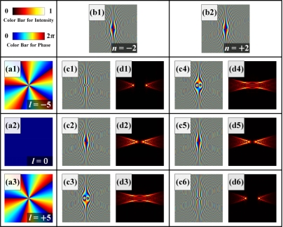 涡旋光束是一种具有螺旋相位波前和明确轨道角动量的奇异光束。涡旋光束的每个光子都携带lℏ的轨道角动量,常被应用于光镊、图像传输、光通信和量子信息技术等领域,而这些应用中很多需要对涡旋光束的拓扑电荷数进行确定,但是涡旋光束的拓扑电荷数无法从强度分布中直接观察到。因此,该课题组提出了一种利用自旋转光束相位测量涡旋光束拓扑电荷数的新方法。以n = +2的自旋转光束相位为例,从理论和实验上分析了通过自旋转光束相位全息图的涡旋光束的远场强度模式。结果表明,当涡旋的拓扑电荷数为正时(也即n⋅l > 0),远场强度分布中两子光束会随着l的增大而远离光场中心,此时通过比值关系(ξ = D/[(d1+d2)/2])可确定涡旋光束的拓扑电荷数。与此不同的是,当涡旋的拓扑电荷数为负时(即n⋅l < 0),光场的远场强度分布中心会出现多条亮条纹,亮条纹的数量N等于|l|−1。该方法可以很容易分辨出涡旋光束拓扑电荷数的正负性,并确定其幅值,如图所示。