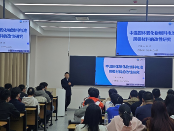 蒋龙副教授的报告题目是《中温固体氧化物燃料电池阴极材料的改性研究》。中温固体氧化物燃料电池(IT-SOFCs)因其高效、低排放等优势成为清洁能源领域的研究热点,但其阴极材料在中温(600–800℃)条件下的氧还原反应(ORR)动力学缓慢与长期稳定性不足等问题制约了实际应用。本研究针对典型双钙钛矿型阴极材料PrBaCo2O5+d中引入过渡金属元素Fe,通过表面性能和体相性能改性策略优化其电化学性能与耐久性,抑制Sr偏析并增强离子传输,显著改善了阴极材料的稳定性。通过XRD、XPS、EIS及弛豫时间分布(DRT)等表征手段的分析表明,改性后的阴极材料在活性-稳定性协同优化方面表现突出,为IT-SOFCs的实用化提供了材料设计新思路。