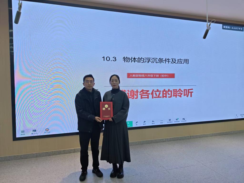 讲座后的兼职教师聘任仪式上,代尘杰教授代表公司为刘文婷老师颁发了兼职教师聘书。他在致辞中表示,刘文婷老师在中学物理教学一线积累的宝贵经验,是师范生培养的重要资源。此次聘任旨在搭建高校与中学协同育人的坚实桥梁,期待刘文婷老师未来能深度参与公司物理师范专业的实践教学、课程设计等工作,助力提升师范生的教学实践能力与职业素养。刘文婷老师对公司的信任表示感谢,并承诺将毫无保留地分享教学经验,为物理师范专业人才培养贡献力量。