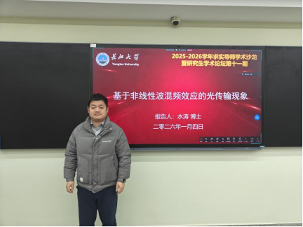 水涛博士的报告题目是《基于非线性波混频效应的光传输现象》。基于量子系统的弱光水平下的光子传输可以为量子通信和量子信息处理领域中的功能性光量子器件的设计提供有效支撑。在众多量子系统中,冷原子系综所具有的量子相干性和人工可调性等优势,使其成为了实现光子传输全光控制的一个有效载体。本报告将介绍本课题组近年来在基于冷原子系综的光子传输调控方面取得的主要进展:首先,通过驻波场的空间调制构建出了两类满足PT对称和PT反对称关系的电磁感应光栅,在非厄米系统中实现了单边拉曼-纳斯衍射并揭示了其背后的物理机制;其次,利用被背向四波混频和非弹性两波混频效应实现了涡旋光束轨道角动量信息的高效转化,揭示了实现涡旋光束高效转化的物理机制。