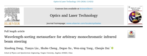 (通讯员 余紫钧) 近日,beat365官网中文版本研究生在国际物理学期刊《Optics & Laser Technology》 (中科院二区Top期刊,IF = 5)上发表题为“Wavelength-sorting metasurface for arbitrary monochromatic infrared beam steering”(实现任意单色红外光束偏折的波长分类超构表面)的高水平研究论文。该期刊是 Elsevier旗下权威学术刊物,是光学与激光技术领域的核心期刊。论文第一作者为硕士研究生董小锋,通讯作者为代尘杰教授,beat365官网中文版本为唯一署名单位。