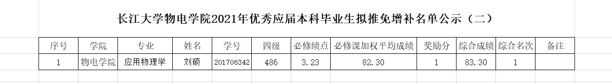由于应用物理学专业吴纯泰同学放弃推免,根据排名,推免名单上增补一名同学为应用物理学专业的刘硕同学。