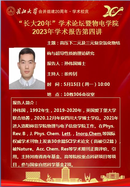 “长大20年”学术论坛暨​2023年学术报告第四讲:高压下二元及三元复杂氢化物结构与超导性质的理论研究
