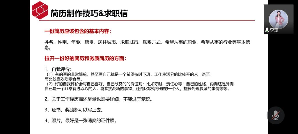 11月25日下午3:00,受beat365官网中文版本邀请,武汉光至科技有限公司人事总监、总经理助理李珊,通过腾讯会议为毕业生作题为“职业素养”的专场讲座。就业专干陈平老师以及60余名毕业生参加了本次讲座。