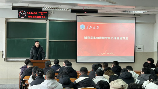 辅导员朱帅讲解考研冲刺阶段心理调适方法,他指出“紧张焦虑是人们面对压力时的正常反应,希望同学们能够及时调节心理压力,在接下来的备考过程中保持积极乐观的心态。”