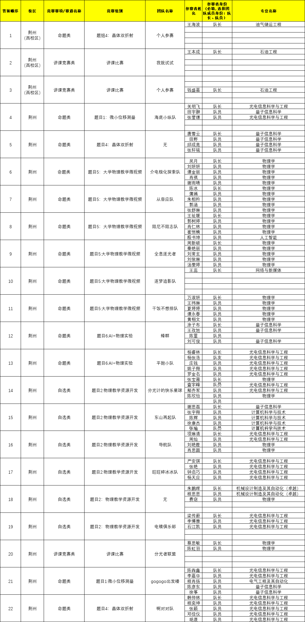 1、“第十一届湖北省物理实验创新设计竞赛校赛选拔赛”定于2025年5月15日,在主教楼406实验室进行,答辩顺序如下图所示。