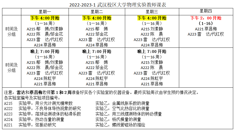 2022-2023-1武汉校区大学物理实验课表