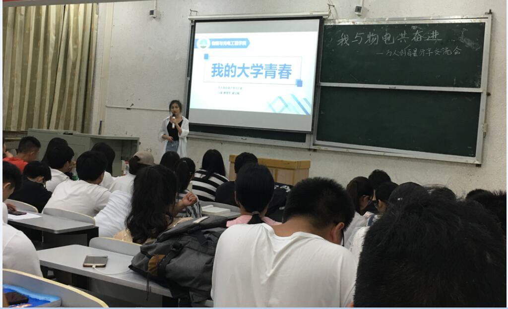 (文/王杰辰 摄/王诗蘅)4月25日晚7:00,“我与物电共奋进”万人创百星分享交流会在5教103如期举行。辅导员陈平、王苗、兼职辅导员龚道来以及2018级全体同学参加本次交流会。