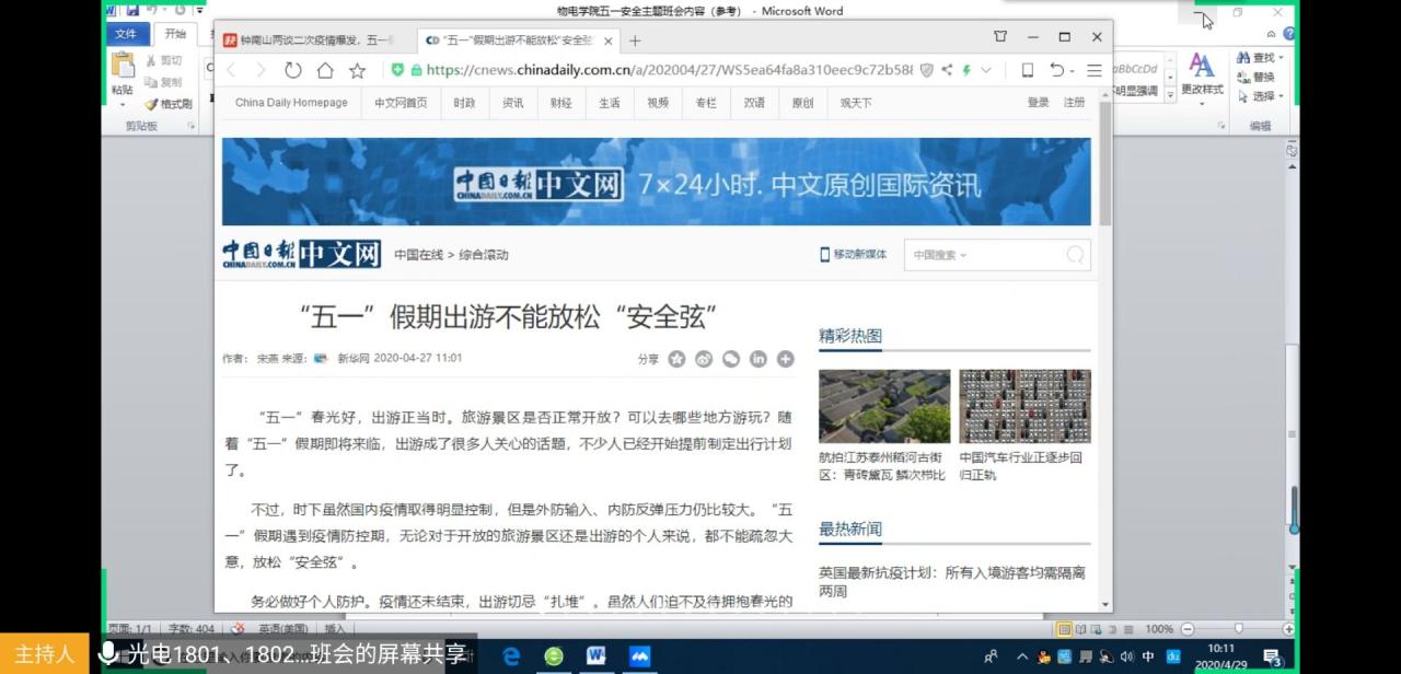各班级通过腾讯会议、QQ直播等网络方式在班主任老师的指导下,认真召开了安全教育班会。同学们认真学习了中国疾控中心和钟南山院士、李兰娟院士关于此次“五一”节假日安全方面的要求,班级明确强调了禁止员工私自返校的规定。班会上,各班班主任就长期居家学习向同学们提出指导建议:建议同学们合理安排作息,不沉迷游戏不沉迷刷短视频;关照好自己的情绪,保持身心健康,遇到心理危机积极向老师和公司心理中心求助;珍惜与家人相聚时光,主动与父母沟通。同时,班主任老师提醒参会的家长重视员工假期安全,希望家长们关注员工情绪,主动与员工谈心,建立和谐亲子关系。