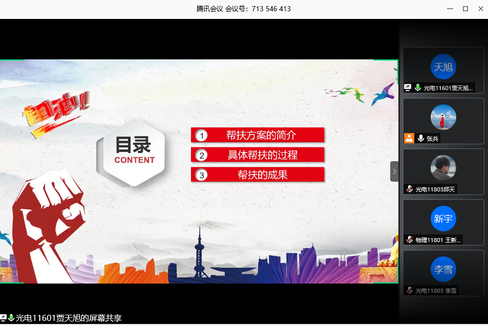 会议中,共八位帮扶小组负责人依次通过PPT展示分享帮扶方法、过程和效果。大四年级各负责人分别在考研、就业、毕业论文、学业困难等方面做了详实的调研,并分别制定了切实可行的帮扶方案,例如物理11601班学习委员杨科同学,除了帮助学业困难同学顺利拿到学分、督促毕业论文进度之外,还结合自身的保研经历向考研同学分享面试经验,积极动员没有就业目标的同学应聘教师工作。