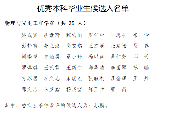 根据公司《关于开展2022届优秀本科毕业生评选与表彰工作的通知》文件要求,经个人申报、班级评议、公司审核,现将公司优秀本科毕业生候选人名单予以公示,征求师生意见,接受监督。公示期:2022年4月28日至2022年5月4日。公示期内,如有异议,可以书面或电话形式向公司员工事务办公室反映。
