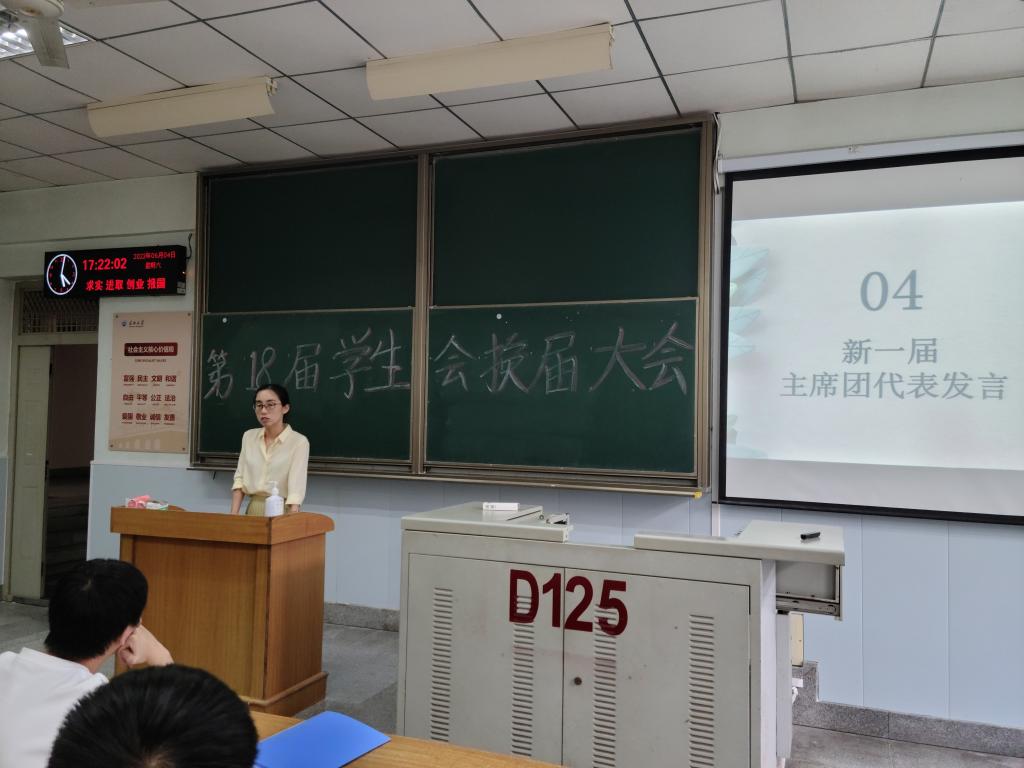 大会伊始,各部门负责人进行工作总结,总结了各个部门的学年工作完成情况与不足,以及对下一届部门负责人的建议。其后,黎俊宏主席作为18届主席团代表上台致辞,总结了本届部门改革进展与本届员工会工作的长处以及不足并对下一届留任成员提出建议,紧接着新一届员工会主席王圣夹发表讲话,提出了强化内部建设与工作开展分工两点蓝图规划。