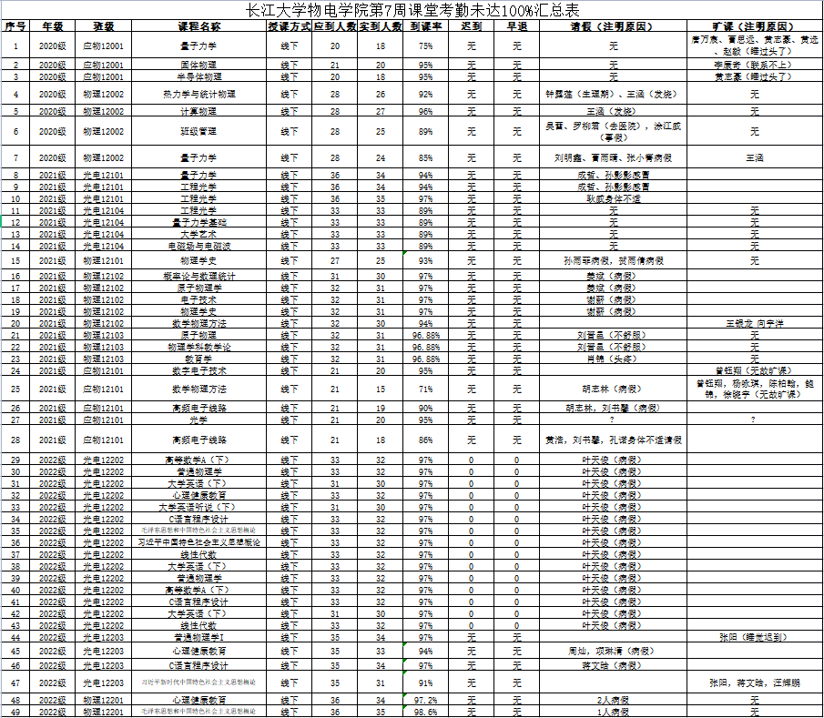 3月27日—4月2日,公司组织员工干部对20、21、22级21个班的47门课程进行了208次课堂考勤,100%到课率159次,现将考勤结果公布如下: