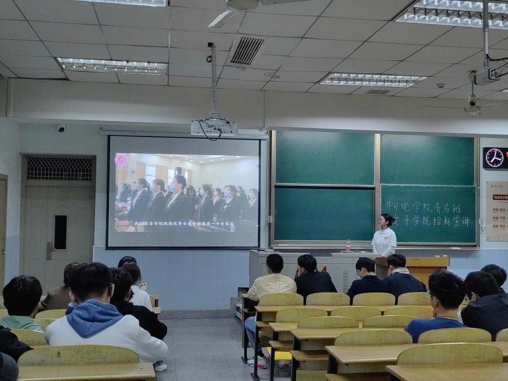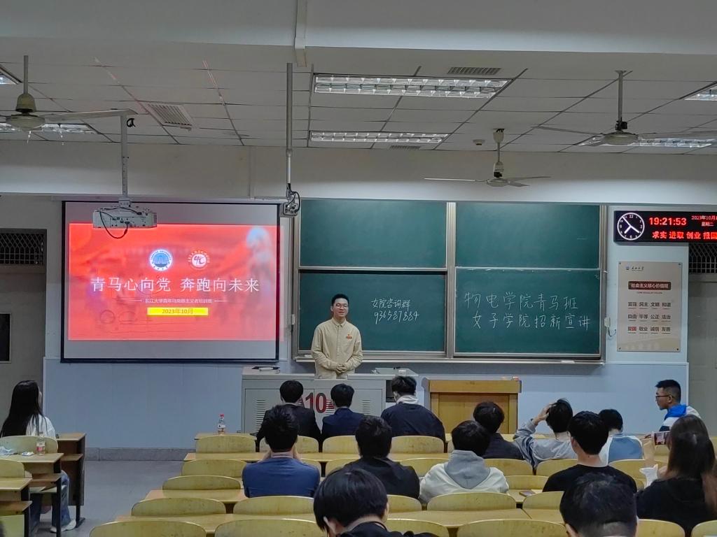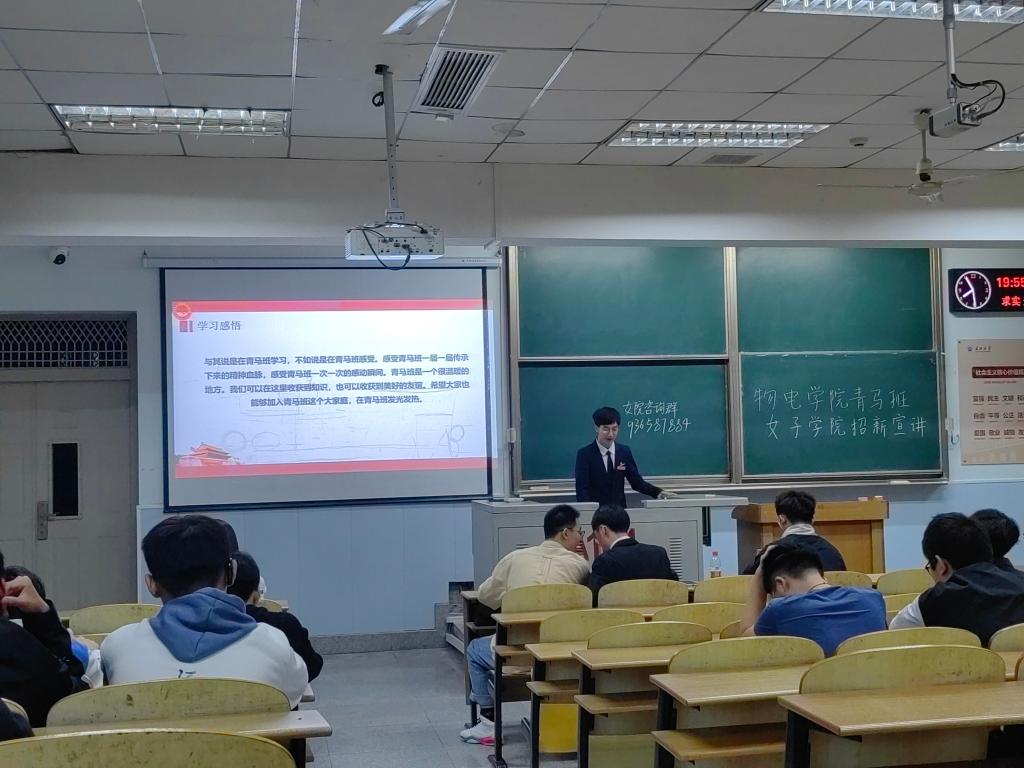 宣讲伊始,校青马班学员代表胡智豪详细介绍了校青马工程遴选机制,同时也向大家展示了往届成员在青马班的点点滴滴,随后,往届青马班的优秀成员董礼、陈浩洋、王文娟、朱静蕾分别从思想、学习、能力等方面介绍了他们在青马班锻炼后得到的提升,总结为“思想上有信仰,学习上有进步,能力上有提高,同学中有威信”。