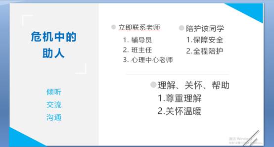 此外,朱帅老师对“公司心理健康教育体系”进行介绍,告知大家公司心理危机干预体系、各个校区心理咨询室地点和负责人联系电话,呼吁同学们遇到心理困扰时可以积极地向信任的老师求助、主动去心理健康教育中心咨询以排解压力,并且能及时发现周围同学所存在的问题并给予帮助。
