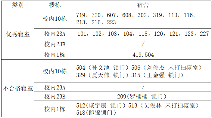此外,宿舍安全卫生检查情况将作为评选“优秀班级”、“活力团支部”等集体荣誉的重要考察指标。