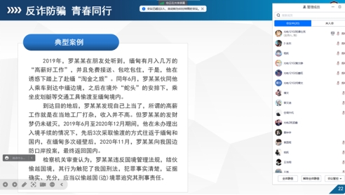 会上,各班结合典型案例,对部分诈骗类案件产生的原因进行简要分析,深入浅出地讲解了不法分子的惯用伎俩和手段,帮助同学们了解并掌握有效预防诈骗。同时,在日常生活中要提高安全防范意识,遇骗不惊,不贪小利。