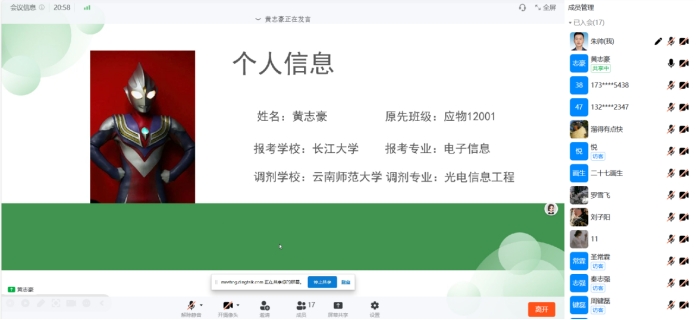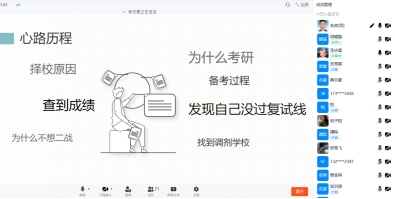 三位学长接力发言,分享了各自在调剂过程中的宝贵经验。官国祥分享了自己在收集上海地区院校调剂信息时的独到方法,以及如何针对性地准备应用技术大学的复试。李庆晨则围绕青岛大学调剂志愿填报的注意事项展开,结合自身经历,给出实用建议。黄志豪分享了在调剂复试中脱颖而出的面试技巧,还讲述了自己在调剂阶段应对压力的心路历程。在互动答疑环节,同学们踊跃提问,嘉宾们一一给予耐心、详尽的解答。