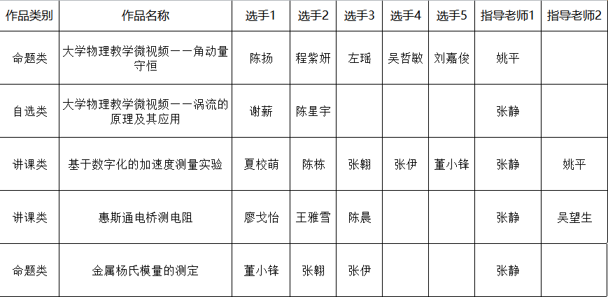 根据第九届全国老员工物理实验竞赛的章程要求:每个公司最多5支队伍,每支队伍参赛指导教师不得多于2人,员工不得多于5人,其中讲课比赛项目只限主讲员工个人参赛。每所高校报名时,第一、二竞赛类别每类最多3支队伍,第三竞赛类别最多2支队伍。综合各个报名队伍的申报书、视频、PPT及实物展示表现,推荐以下5支队伍参加全国赛: